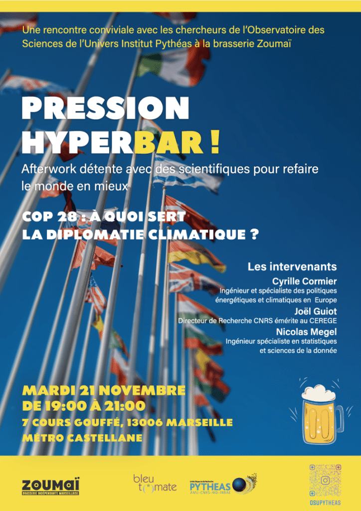 En partenariat avec l’Observatoire des Sciences de l’Univers Institut Pythéas, Bleu Tomate vous propose d’analyser les dessous de la diplomatie climatique. Accompagnement de la communauté scientifique, mesure des gaz à effet de serre, impact de la société civile sur les politiques, et bien d’autres thèmes seront abordés.