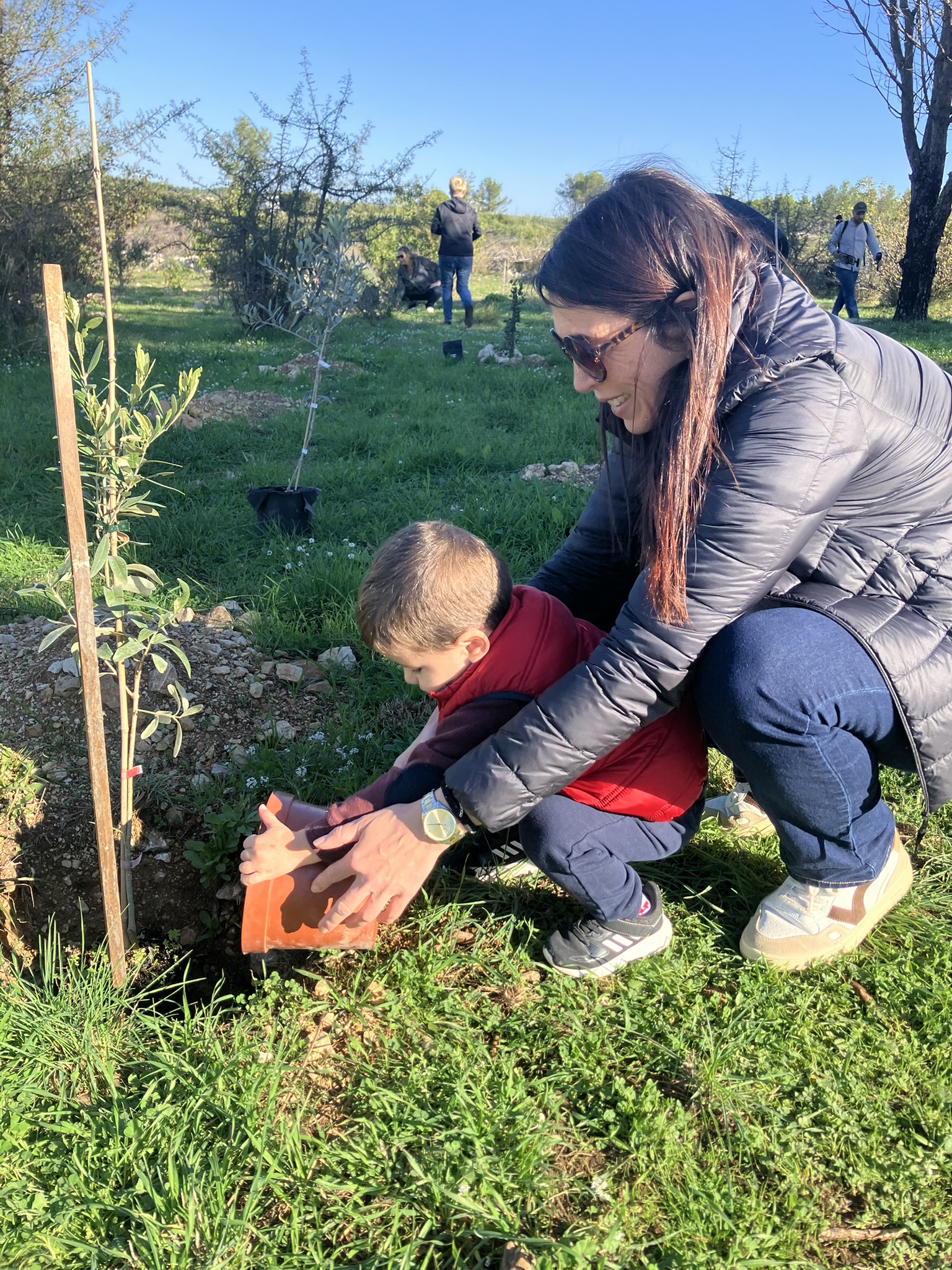 Audrey, maman attentive, veille à ce que ses fils -Marin et Mallow- plantent correctement l’arbre qu’ils ont choisi. « Nous avons emménagé quelques mois après l’incendie, mais cet épisode a durablement marqué le quartier qui a vu le feu frôler les maisons. C’est un endroit où nous venons souvent en famille, et planter cet olivier est pour nous un symbole fort, un acte important vis-à-vis de nos enfants. »
